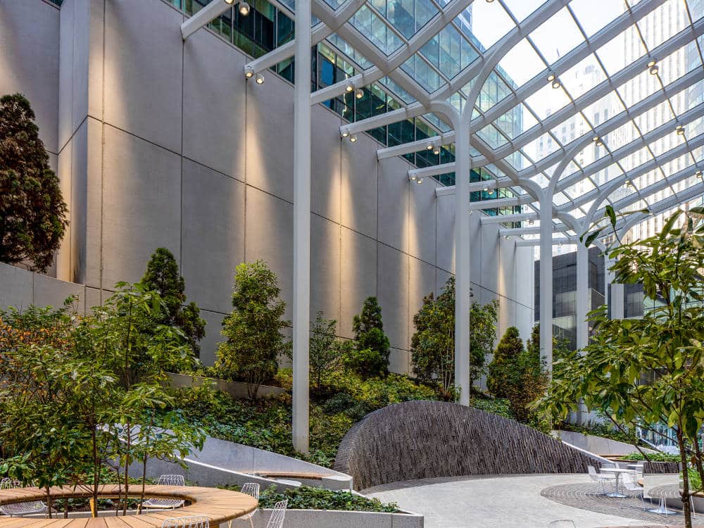 Una maravillosa zona verde florece en uno de los rincones más urbanizados de Nueva York. El estudio de arquitectura noruego-estadounidense Snohetta ha convertido un espacio abierto de 2000m2 del centro de Manhattan en un verdadero paraíso, exquisitamente diseñado. Entre las calles 55 y 56 de la Avenida Madison se ha habilitado una zona ajardinada semicubierta, con más de 300 arbustos, 15.000 flores y 40 árboles. Los proyectores de exteriores Kona de Erco, que se encuentran instalados en las vigas de acero del techo acristalado de este oasis verde, ofrecen suficiente luz y luminosidad a los visitantes y a la vegetación.