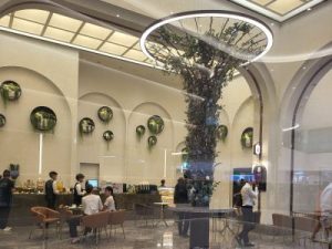 El diseño interior es tan inusual como el exterior. Los retos eran muy diversos: desde la iluminación diurna de los alimentos en las tiendas de alimentación hasta la puesta en escena eficaz de los grandes murales en la galería.
